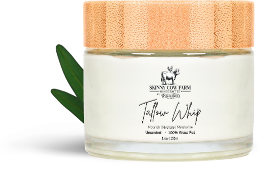 Our 100% grass-fed tallow is sourced from pasture-raised cattle, offering pure, nutrient-rich nourishment for your skin.